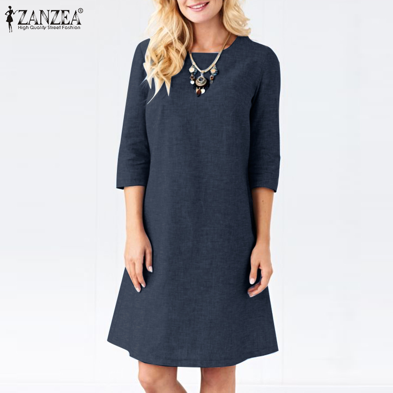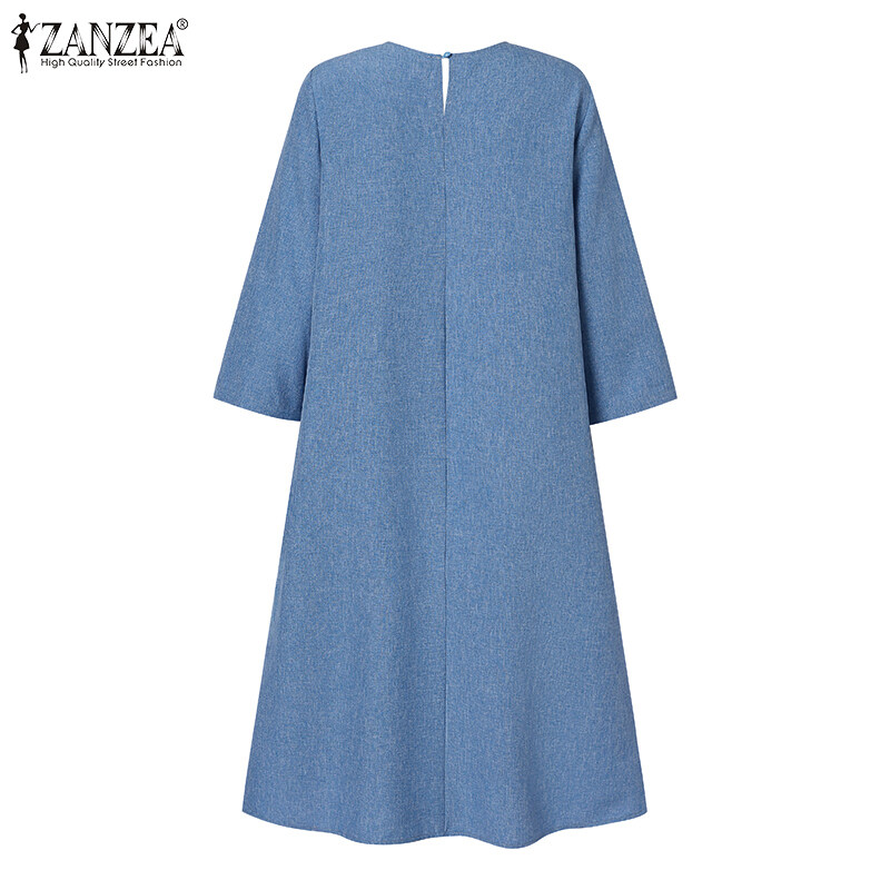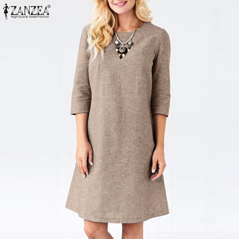 ZANZEA Women Vintage Simple 3/4 Sleeve Midi Dresses Loose Solid Round Neck Sundress #15